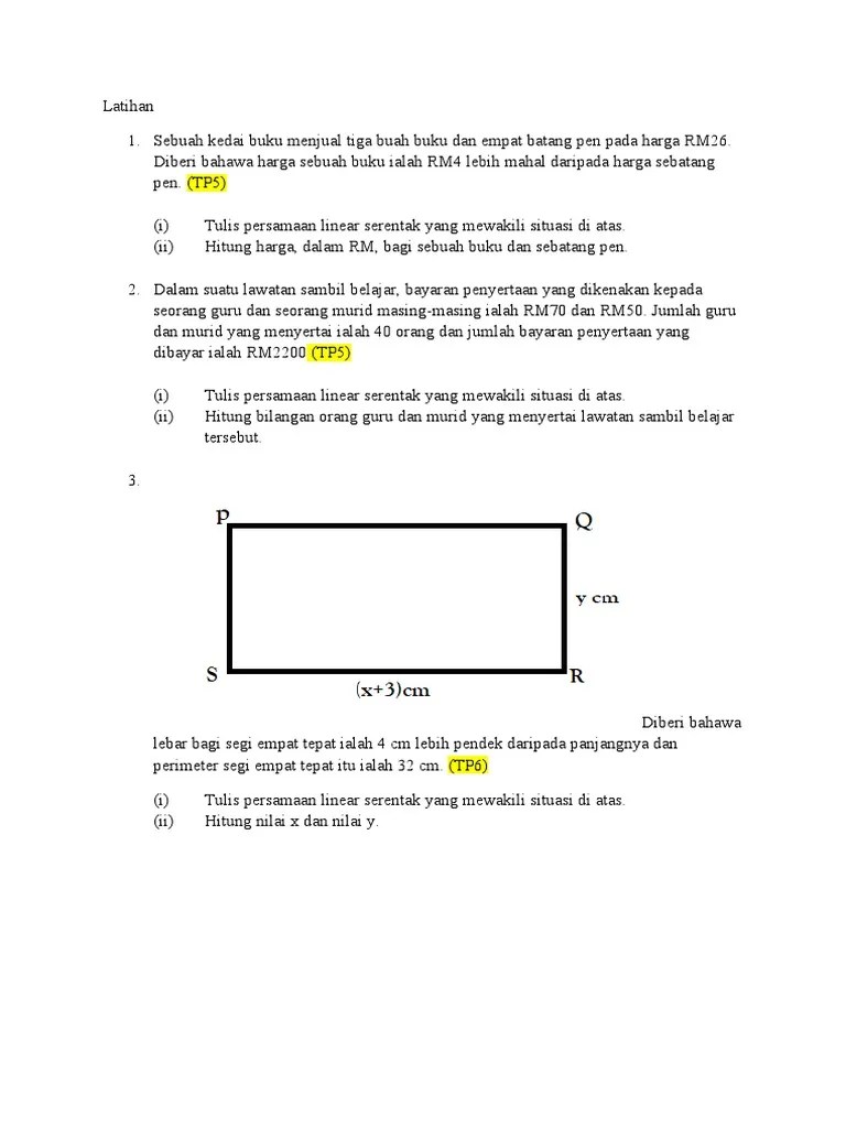 Pentaksiran berasaskan sekolah matematik tingkatan 2. Harga sebuah buku latihan adalah tiga kali harga sebatang pen. Bulatkan semua persamaan linear dalam yang 4.
